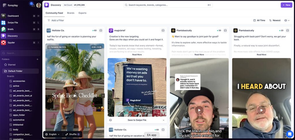 Foreplay allows you to explore a wide selection of real-world ads across platforms like Facebook, Instagram, and TikTok. You can filter by industry, brand, or campaign type, making it easy to find inspiration relevant to your niche.